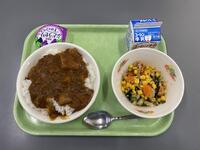 今日は「ポークカレーライス」について紹介します。明日でいよいよ3年生は中学校の給食が終わります。そこで、今日は給食の中でも人気メニューの一つ、ポークカレーライスにしました。今日のカレーは、いつもの作り方に一手間加えています。豚肉の肩に近い背中の部位である、肩ロース肉を、カレーの釜とは別に、1時間、コトコトじっくり煮込みました。肩ロース肉は、うまみやコクがあり、柔らかくおいしい部位です。それを、後からカレーと合わせて仕上げたので、トロトロとした食感が味わえます。野菜と一緒に、チャツネという調味料や、りんごソースを入れて煮込み、仕上げに複数のスパイスを混ぜ合わせた南流山中・東部中特製のカレーです。豚肉のうまみを味わいながら食べましょう。