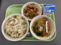 【メニュー】赤飯 鶏のから揚げ 五目煮 沢煮椀 牛乳