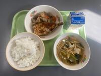 今日は「さばの香味みそだれ」について紹介します。さばには様々な栄養が含まれていて、エネルギーをつくる栄養素であるたんぱく質を多く含んでいます。たんぱく質は体の中で細胞を構成する大切な成分で、筋肉や皮ふ、ホルモンなどの成分として存在しています。不足すると体の中の免疫機能が低下してしまうおそれがあります。感染症予防のために、免疫機能を高めることはとても大切です。給食だけでなく、家庭でも食べる機会があれば積極的に食べるようにしましょう。今日は、香味野菜であるねぎ、しょうが、にんにくをごま油で炒めてから、みそなどの調味料を加えて煮詰めた、特製だれをかけています。ごまの風味と、甘味がおいしいたれです。小骨に気をつけて食べましょう。
