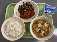 牛乳 ごはん かつおの甘辛しょうがソース ねぎすきじゃが 豆乳みそ汁