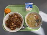 牛乳 青ねぎチャーハン 厚揚げの中華炒め 鶏肉とキャベツの白湯スープ みかん