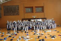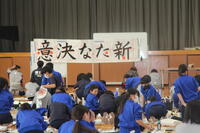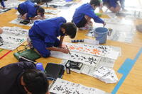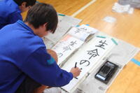 本日、体育館にて1・2年生による「書き初め大会」を開催しました。どの生徒も真剣な面持ちで筆を握り、力強く、そして丁寧に、1年生は「新たな決意」2年生は「生命の尊重」という文字をしたためていました。紙にすべらせる筆の音が響き、会場全体が集中と緊張に包まれていました。