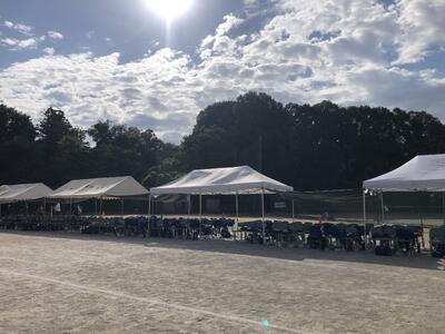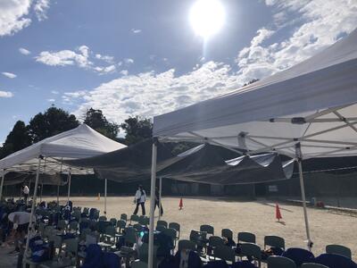 朝晩はようやく涼しくなり、秋の訪れを感じる今日この頃ですが、日中は日が当たるとまだまだ暑さを感じます。本校では、熱中症予防として、応援席にテントとシートを設置し、安全に体育祭を実施することに努めています。