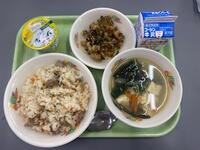 【メニュー】牛乳 焼き肉チャーハン ゴーヤとじゃこと大豆の揚げ煮 わかめスープ レモンヨーグルト