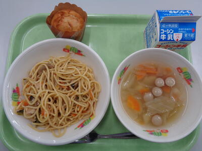 【メニュー】鶏ときのこの和風スパゲッティ ウィンナーポトフ いちごマフィン