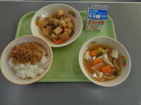 牛乳 アーモンドと小魚のふりかけ 大根と厚揚げのそぼろ煮 さつまいものみそ汁
