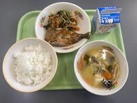 今日は、「さばのカレー醤油かけ」について紹介します。さばには様々な栄養が含まれていて、エネルギーをつくる栄養素であるたんぱく質を多く含んでいます。たんぱく質は体の中で細胞を構成する大切な成分で、筋肉や皮ふ、ホルモンなどの成分として存在しています。不足すると体の中の免疫機能が低下してしまうおそれがあります。感染症予防のために、免疫機能を高めることはとても大切です。給食だけでなく、家庭でも食べる機会があれば積極的に食べるようにしましょう。今日は、甘塩っぱい和風のしょうゆ味にカレー粉を加えて煮詰めた、特製だれをかけています。小骨に気をつけて食べましょう。