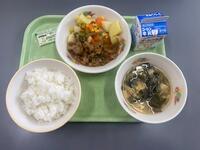 ひじきのガーリック混ぜごはん 韓国風肉じゃが キャベツと油揚げのみそ汁 牛乳