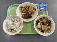 今日で、2年生の考案献立は最終日です。2年6組の生徒が考えた献立で、献立名は「秋の味覚献立」、PRポイントは「さつまいもと秋なすを使い、旬のものを取り入れました。」とのことです。さつまいもは、10月から11月の献立にたくさん取り入れているように、1月頃にかけて千葉県でもたくさん栽培されている食材です。なすは、夏から秋にかけて旬を迎える野菜で、一般的に夏のなすは、皮が厚めで実がしっかりめ、秋のなすはしっとりと水分を多く含んだやわらかめの実が多いといわれます。