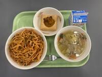 今日は、南流山中学校2年1組の生徒が考えた献立です。献立名は「韓国風給食」、PRポイントは「チャプチェ、キムチと韓国料理で統一したところです」とのことです。しょうがやにんにく、長ねぎなどの香味野菜や、キムチの辛味を取り入れた、体が温まるような献立になっています。ちなみに、チャプチェは伝統的な韓国料理の1つで、家庭でもよく作られ、お祝いの席でも食べることが多いです。チャプチェの「チャプ」は“数々のものを混ぜ合わせる”という意味で、「チェ」は“細切りにした食材やおかず”を意味します。色々な野菜の食感と、うまみをしっかりと吸った春雨がおいしい料理です。よくかんで食べましょう。