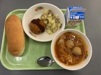 【メニュー】ごはん 根菜酢鶏 ワンタンスープ 牛乳
