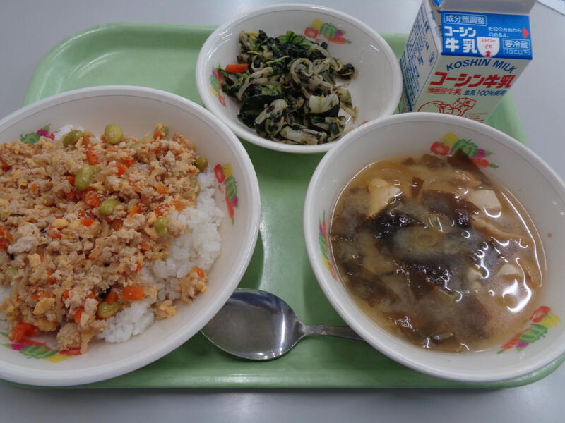今日のご飯は、色鮮やかな三色丼!肉そぼろには、だしがしみこんでいてご飯によく合います。枝豆が入ることで、彩りも豊かになっていました。