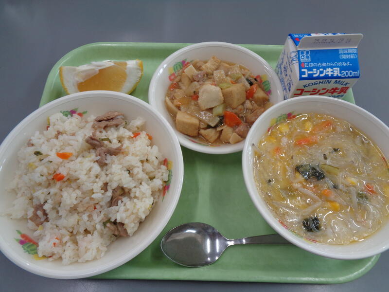青ねぎチャーハン 厚揚げの中華炒め 鶏肉と野菜の白湯スープ 河内晩柑