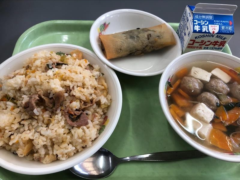 キムチチャーハン ひじきの春巻き 肉団子のスープ