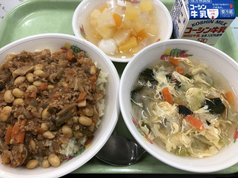 きのこのキーマカレー 洋風かきたまスープ 白玉フルーツポンチ