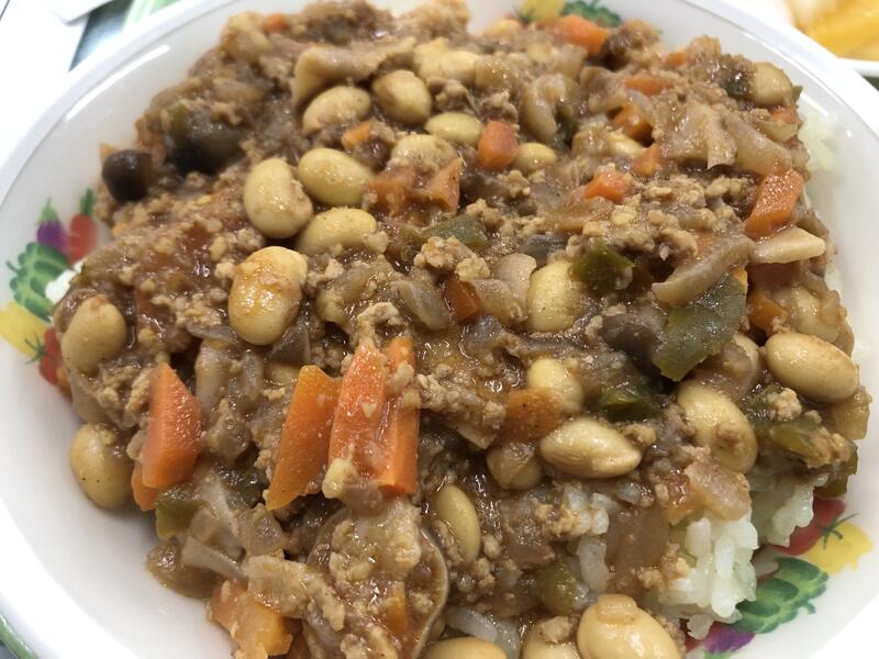 ひき肉だけでなく、お豆などのお野菜もたくさん入ったキーマカレー!お野菜の苦手な子でももりもり食べられる色合い豊かな一品でした。