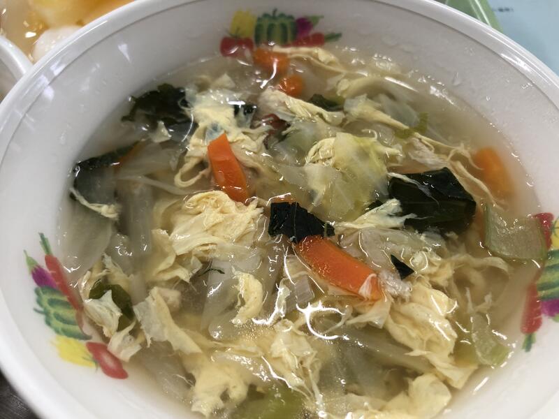 かきたま汁は、中華スープにふわふわ卵とえのきやとうふがふんだんに入っていました。そして、青ねぎが大人の味を演出していました!