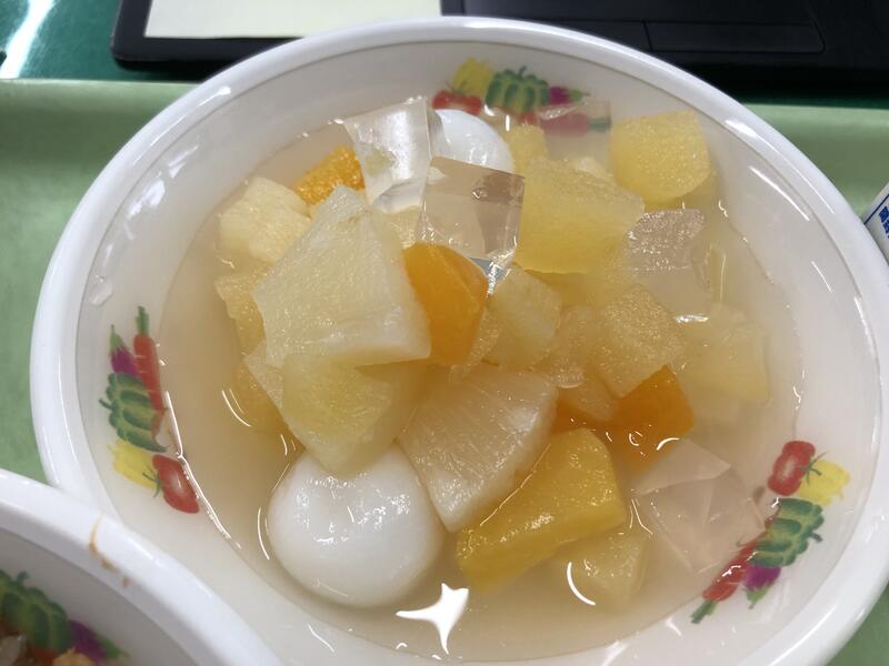 お口直しのメニューはフルーツポンチ!あま~いフルーツにぷるぷるゼリー、そしておなじみ白玉が入ることで、様々な触感が楽しめる幸せな一皿でした♪