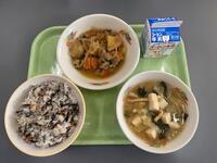 ひじきのガーリック混ぜごはん 韓国風肉じゃが キャベツと油揚げのみそ汁 牛乳
