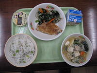牛乳 鶏肉とひじきのまぜごはん いわしのさんが焼き ごまあえ