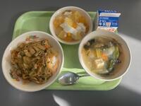 【メニュー】豚キムチ丼 春雨スープ 杏仁豆腐 牛乳