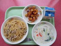 焼きそばといえばソース味が主流ですが、地域によっても色々な味付けがあります。今日は上海焼きそば風にオイスターソースで味付けしました。麺がもちもちしていて美味しいと子どもたちに好評でした。もっと食べたかったとの声が多かったです。
