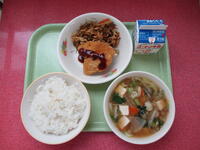 牛乳 ガパオライス 鶏肉のオレンジ焼き 豆腐とキャベツのアジアンスープ