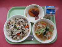 牛乳 鶏ごぼうごはん 竹輪のカレー揚げ むらくも汁