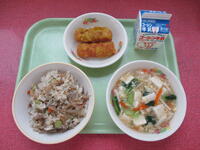 牛乳 ひじきとベーコンのピラフ コロッケ スープフォー