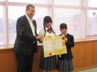 先日、八木中学校を代表して1年生の前川さんと菊池さんがJA八木支店へ行きました。毎年、入学式と卒業式にご厚意でサイネリアをいただいており、そのお礼に伺いました。事前に学年の数名がメッセージカードを書き、イラストや折り紙できれいに装飾し、当日2人からお渡ししました。「色鮮やかなサイネリアをいつもありがとうございます」「毎年とてもきれいなお花をありがとうございます」と感謝の気持ちを届けました。