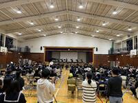 1年生が学年レクを行いました。種目は、イントロクイズ、8の字跳びを行いました。イントロクイズでは、曲の始めを聞いて、その続きを歌うという方式で行われていました。素晴らしい歌唱力を発揮した生徒や、前に出てきたけど歌詞を忘れてしまった生徒が見られ、大いに盛り上がりました。最後には各学年職員から2年生になる生徒達にメッセージが送られていました。
