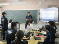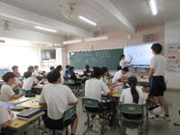 田中教育長と吉川いじめ防止相談対策室長が電子黒板の視察に来校されました。夏休みに大型の電子黒板が導入され、授業や学級で積極的に活用しています。どの授業も電子黒板が視覚的な役割を果たし、学習意欲の向上にもつながっていると思います。視察後、「先生も生徒も楽しそうだった」「手元がしっかり見えるので作業の様子がよくわかった」「生徒も電子黒板を操作していてすごい」といったお言葉をいただきました。今後もより良い活用に向けて検討していきます。