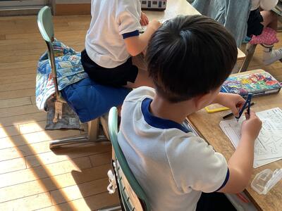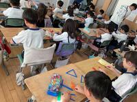 子供達は、等しい辺の長さを見つけるのにコンパスを使って確かめていました。