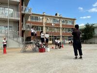 3時間目、中庭で1年生が生活科の学習で「シャボン玉」遊びを行なっていました。