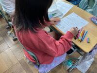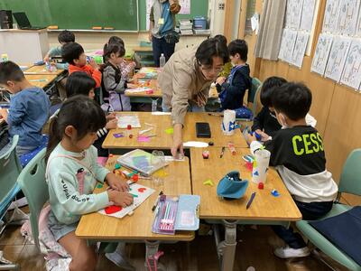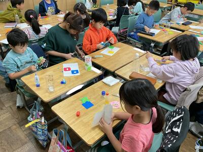 ペットボトルに、好きな形に切った折り紙を貼った紙を巻き付けて作品を作りました。作業を始めるとみんな集中してどんな作品にするか考えました。お花や星、ハートなどいろいろな形が見られます。一人一人、個性のある作品ができあがりました