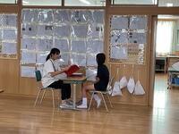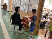 前期に頑張ったこと、後期に頑張りたいことなどを担任の先生といっしょに一人一人確認する様子がみられました。