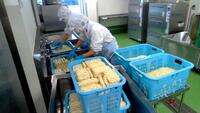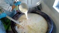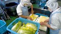 今日は「野菜たっぷり豆乳うどん」です。大根、白菜、小松菜は流山産です。朝早く農家の大作さんと中山さんが届けてくださいました。うどんは、約100㎏使用しました。大量の冷凍うどんをそのまま汁に入れると温度が一気に下がり、温度が上がるまで時間がかかって伸びてしまうので、流水解凍してから入れました。豆乳も煮すぎると分離してしまうので、具材が煮えて味付けしたら、うどん、豆乳、小松菜を入れて一気に仕上げました。寒い日にピッタリで、子どもたちにも好評でした。