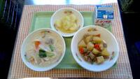 「野菜たっぷり豆乳うどん、野菜のごま煮、きんとん風団子、牛乳」