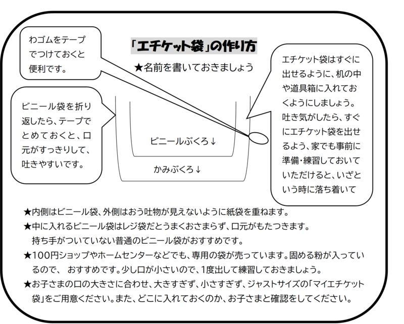 *お子様から「エチケット袋を使用した」と聞いた時は、次の登校時に新しいものを持たせてください。