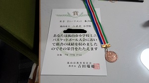 こんにちは トレインです 今回の企画、ミニバスケットボールの大会が終了したので結果発表をします イェーイ 試合結果からです 1試合目は西深井小と戦いました 私はこの試合で出たのですが、がんがん当たってきてびっくりしました ですがこの試合で25‐8で勝ちました! 男子は同じく西深井と戦っていましたが結果は負けてしまいました 点数は覚えていませんが、点差は1点くらいだったと思います 男子は女子の応援を必死にやってくれていたのでその分2試合目も勝って決勝に行こうと思いました 2試合目は向小金小と戦いました ですが負けてしまいました 8‐17でした 向小金小は、優勝していました ドリブルの仕方も違うのでとても勉強になりました 来年から大会はありません なので今年で最後でしたが3位入賞ということでとてもうれしく思います もっと練習していれば優勝できたのではないかと反省しています 3位はメダル、そして賞状ももらえます なので、記念が残ってよかったです なおこの写真はメダルと賞状です |