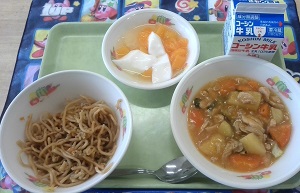 こんにちは!外が暑くて大変!おにぎりくんです! 今日の給食はメインの!「肉みそ焼きそば」、おかずの「ジャガイモのとりからに」デザートの「杏仁豆腐」です! 特に杏仁豆腐のおかわりはすごかったです!クラスの半分以上の人が並んで大人気でした! さらに、栄養をみると、体の調子を整えるものがたくさんありました! 皆さんもしっかり食べて、栄養を取りましょう! いいねボタンお願いします~さようなら~ |