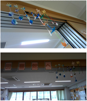 どうも!甘いケーキです! 図書室の不思議な飾り見たことありますか? 「八木北小学校図書館へ」のとなりにかざりがあります。 これは、なんでしょう? これは、季節により色々なかざりがあります。 みにきてねー。 |