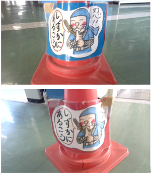 本文  こんにちは!学校については詳しいはずのトレインです!今日はあるところに置いてあったコーンに貼ってあるしずかに歩こうと書いてあるものです!!