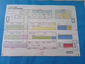 その案内マップは、一階の事務室前です。案内マップではなくても、高学年や先生方に聞けばわかると思いますよ(^▽^)/