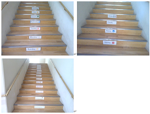 説明しよう!!階段で勉強とは、階段の側面に何かがなどが書かれています。たとえば英語の単語などがあります。