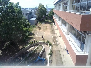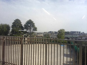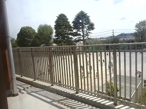 それは・・・5校舎二の校庭側の教室のベランダです。そこで見る景色は(2回目)校庭で元気に遊ぶ子供たちの姿や、自然豊かな校庭を見ることができます。