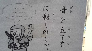 どうもこんにちは、にゃん太郎です! 今回の記事は「八木北小学校に忍者が出没!?」です。 「な~んかネタないかな~」と学校内を探索していたら、忍者がいたんです! 周りの人に迷惑をかけないための張り紙らしいです。 じゃ、次回の記事もお楽しみに!! |