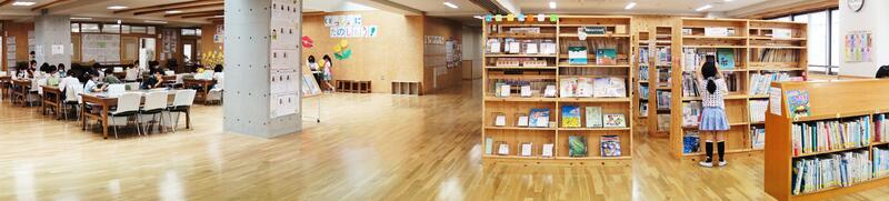 八木北小学校 図書館 と オープンスペース で 本を使って 調べ学習をする 児童の様子