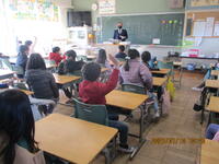 同じく24日には、1年生が、英語活動を行っていました。私がお邪魔したときには、”Simon says”のゲームをしていました。”Simon says”の声がかからないと命令に従ってはいけないのですが、先生の上手な誘導に子供たちはあっさり引っかかっていまいます。でも、子供たちのやる気はMAXで、楽しく活動することができました。