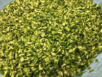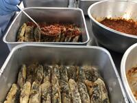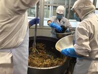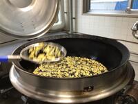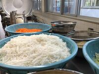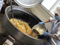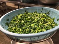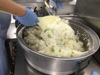 「子どもたちにおいしいものを食べてもらいたい。」というのが口癖の調理員さんがこだわっている一つが、野菜の和え物です。大量調理では、タレの塩分で野菜から水分がでてしまい、べちゃっとしてしまいがちです。そうならないために、茹でた野菜を水冷し水分をしっかりと切ってから、冷蔵庫で冷たく冷やします。そしてタレを少し和え、でてきた水分をひしゃくで丁寧に取り除きます。”少しのタレで和えて+取り除く”を3回繰り返してから、タレとのりを和えました。余分な水分もなくおいしくきれいに仕上がりました。子どもたちもよく食べてくれていました!